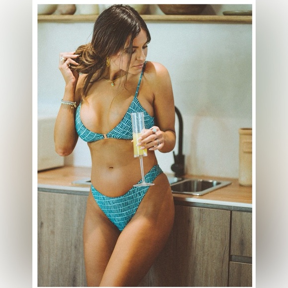 Gorgeous abstract style Jordan “Annia” bikini in Aqua from the Poema swim collaboration with Jordan Underwood. This sexy two piece swim bikini set is a summer that is sure to turn heads!