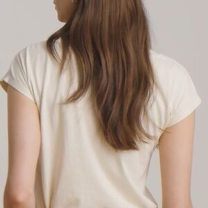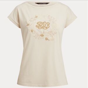 Short sleeves. Floral motif and script “LRL” embroidered at the front.