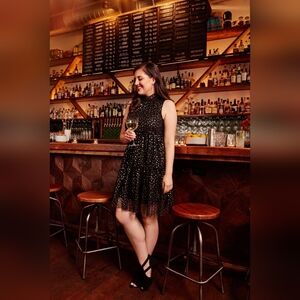 NWT POPSUGAR “Lucky Star” Black Metallic Gold Stars Keyhole Back Dress Medium