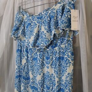 NWT POPVIL Blue/White Floral pattern strapless maxi dress with ruffles in Sz (M)