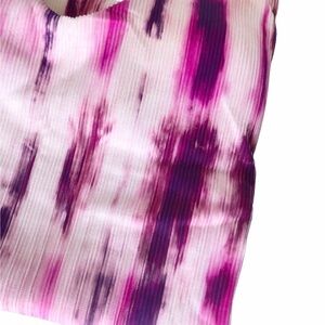 A sexy pink tie dye one piece ribbed bathing suit that features a scoop back and halter straps that tie at the neck, this suit also comes with removable padding.