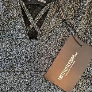 NWT PRETTYLITTLETHING SILVER GLITTER CROSS FRONT PLUNGE BODYCON DRESS SZ.6