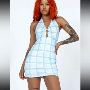 NWT PRINCESS POLLY- SIZE 8 PLAID HALTAR MINI DRESS BLUE