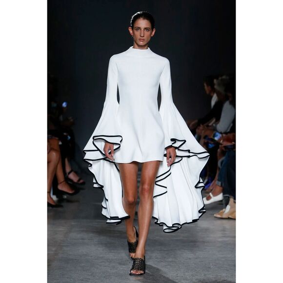 Proenza Schouler's mini dress premiered at the label's Spring '23 show, which was replete with Latin-inspired design details. Cut from black stretch-crepe, it has voluminous ruffled sleeves that trail dramatically. Complement the distinct white trims with tonal pumps and a clutch.