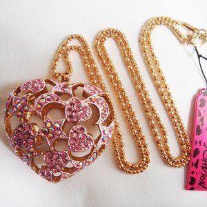 Betsey Johnson necklace with a puffy heart hollow pendant. The pendant measures 1 3/4 inches by 1 7/8 inches, it is made in an openwork metal (filigree) that has stars, hearts and moon designs. The front has pavé pink and aurora borealis pink rhinestones. The back has the same intricate openwork of moons, stars and hearts design in the original state of the metal. The necklace measures 28 inches long with 2 inches extender chain. The measurements are approximated.
