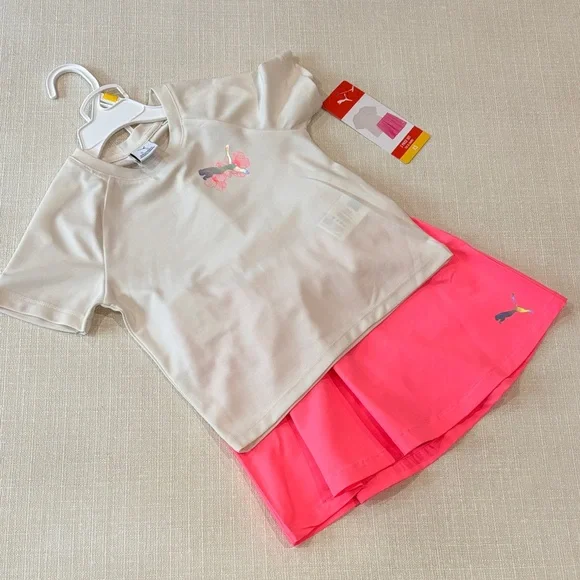 NWT PUMA Kids' Moisture Managing TEE & SKORT Beige and Neon Pink Set