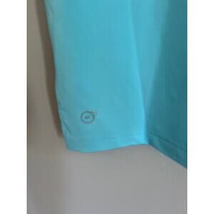 there is a small stain on the collar. It may come out, i havent tried due to the tags still being attached. Size small. The color is a bit brighter blue than pictured.