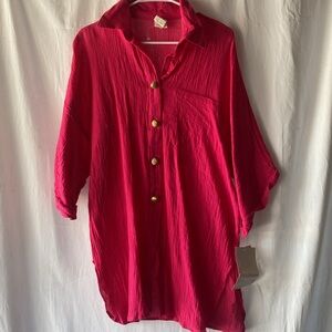 Adorable Bright Pink Swimsuit Cover up tunic shirt light weight 100% cotton. Made in the USA - Vintage NWT