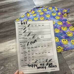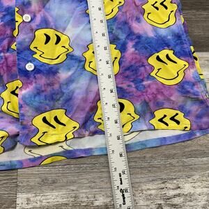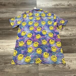 NWT Pacsun Trippy Tie Dye Multicolor Blue Yellow Purple Mens Medium Smiley Faces AOP Rayon Button Up Shirt short sleeve collared all over print aop 100% rayon lightweight casual summer beachy button up shirt