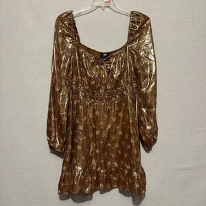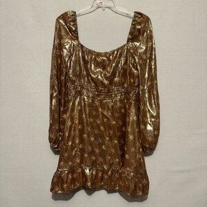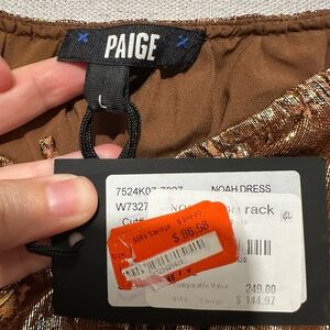 NWT Paige Noah Dress in brown copper. The pefect long sleeve dress for those cooler months. Introducing the Paige Noah Metallic Dress, an exquisite choice for your holiday party wardrobe. This stunning mini dress in Brown Copper features long puff sleeves with elastic cuffs and a striking sweetheart neck. Its lightweight, non-stretch lame fabric is composed of a luxurious 76% silk and 24% metallic blend, enhanced by floral print, ruffle trim, and a smocked elastic waist. Side zipper. Size large.