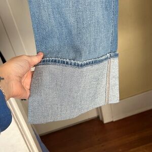 These are 30petite- I’m 5’4” and they still hit my great as an ankle pant. Zipper fly with top button closure, intentionally wide cuffs at bottom, pockets on front and back, the perfect medium wash.