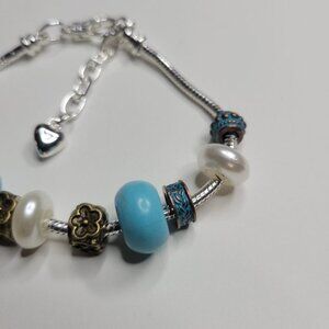 Gorgeous Pandora style bracelet one of a kind, made here in San Antonio that features premium nice copper patina accents, turquoise color European beads, pearly spacer beads, numerous shiny silvery rondelles, and even a couple of chunky bronze flower charms. Measures about 6.75 inches, expandable up to about 8 inches. One end is removable so you can add or remove charms!
