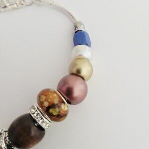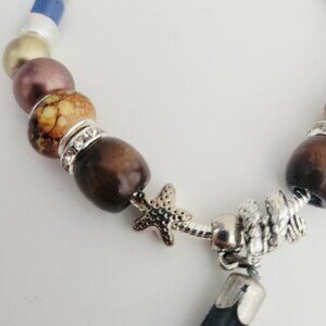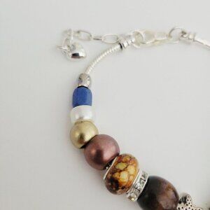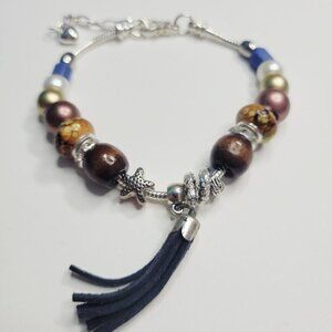 Beautiful, unique, one of a kind – made in Texas. The Woodland Fringe, Pandora style (not real Pandora) charm bracelet can be yours, unadjusted size is 7.75 inches, expands larger. One side is removable so you can dd or remove charms! Includes a snake/serpent charm, a puffy antique star, pearly spacers, a dark blue leather fringe, real wood beads and more! Includes a free polishing cloth and a tarnish free pouch.