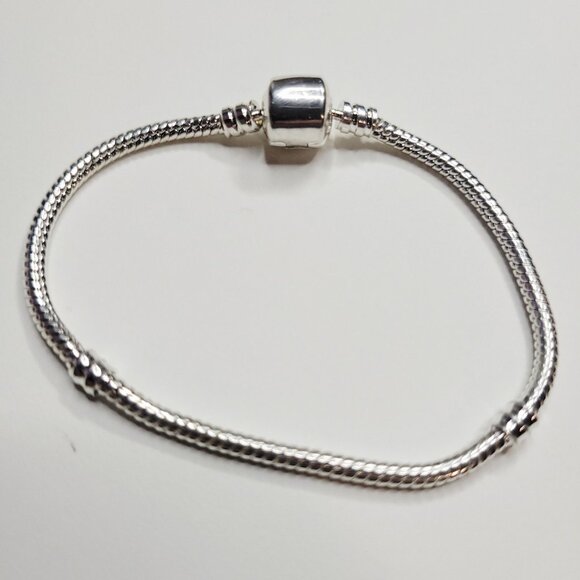 Pandora style snake chain bracelet with no charms. Perfect condition.This is not Pandora. Fits Pandora charms and European charm beads. Shiny silver color. About 6 inches wrist size. Snap barrel closure. We are phasing these out and this is the last one! Includes a polioshing cloth and comes in a tarnish free pouch.
