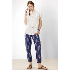Energetic jogger styling: woven Ikat pant in navy blue with purple, gold and white accents. Leg softly gathers with elastic at ankle. Elastic waist has drawstring to adjust to your preferred fit. Hand embroidery embellishes the cargo pockets.