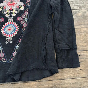 Heavy embroidery to front and back with exposed raw edge seams. Has a thermal lightweight sweater feel.