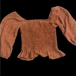 Lightweight. Excellent condition. Versatile crop top, either on or off the shoulders. Puffed sleeve. Color is coral and cream. 100% polyester.