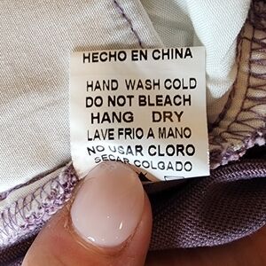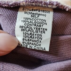 one side is a purple lightweight denim (100% cotton) and the other side is a pleated plaid (polyester/rayon/spandex). purple and green.