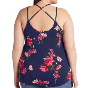 Papermoon navy floral V-neck cami with spaghetti straps in plus sizes 1X to 3X. This sleeveless tank top features a soft, flowy fabric and an allover floral print that adds a feminine touch. The flattering V-neckline and delicate spaghetti straps create a breezy, effortless look perfect for warm weather. Ideal for layering or wearing on its own, this cami pairs beautifully with jeans, shorts, or skirts for casual or dressed-up outfits.