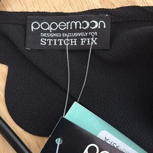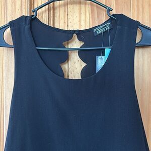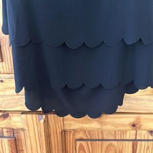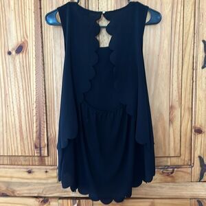 Polyester and spandex top with 3 scalloped tiers in front. Scalloping goes around to the low cut back. One button closure in back. Pit to pit measure is 17 inches. Length is 29.5 inches.