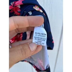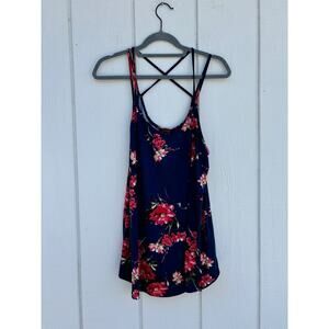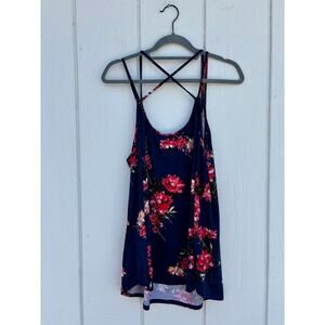 Cute summer top with an all over floral on a navy blue background. Straps cross in back. Measurements in photos.