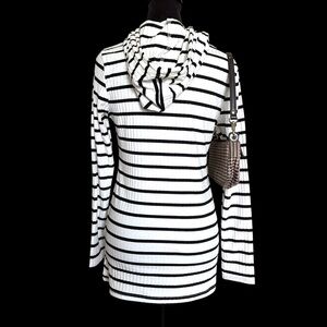 Stay stylish and comfortable with this chic black and white striped hooded top. Perfect for casual outings.