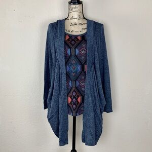 A drape overlay easily gives a layered look to this top. Fit: this style fits true to size. - Scoop neck with drape front overlay - Long sleeves - Geo print bodice - Approx. 26" shortest length, 36" longest length (size Extra Large)
