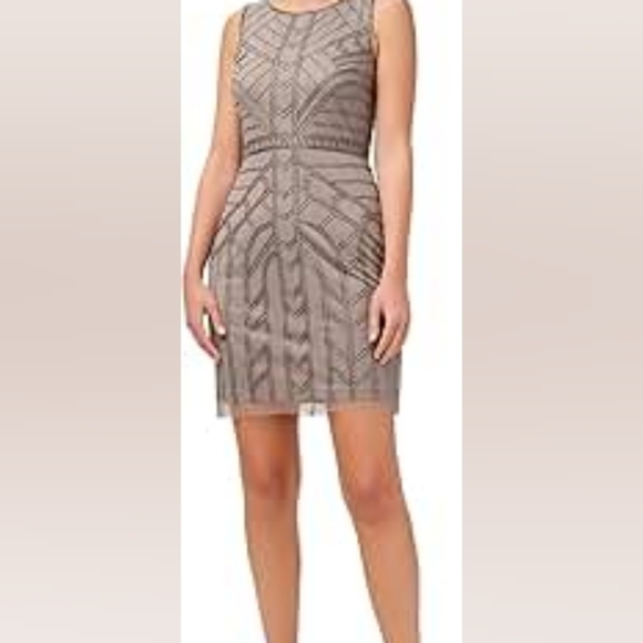 Pappel Studio dress, beaded cocktail dress, mercury gray formal dress, size 16 NWT, geometric beaded design, semi-sheer overlay, evening wear, party dress, boutique style, plus size formal dress