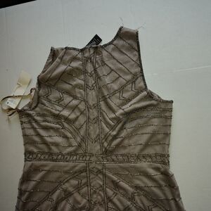 New with tags. This Pappel Studio dress features a sleeveless silhouette with intricate geometric beadwork on semi-sheer fabric. The color is a muted mercury gray, and the fitted shape flatters curves while offering elegant structure. A few beads are missing (shown in photos), but extras are included for easy repair. Missing beads are minimal and do not affect wearability or overall presentation.