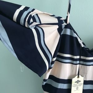 New with tag size 14 ..zipper on the back...open shoulders..colors cream/ blue/ dark blue .... pit to pit 18.5”... length 33.5” like it shows on picture but shoulders strap is adjustable....waist 15”... hips approximately 21”...