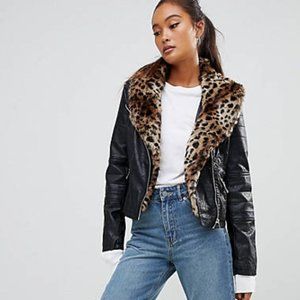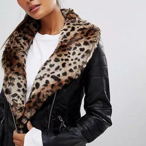 NWT - Parisian Faux Leather Jacket With Leopard Collar - US 10