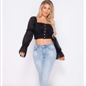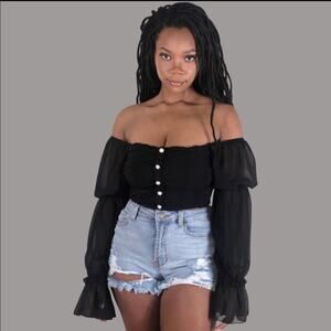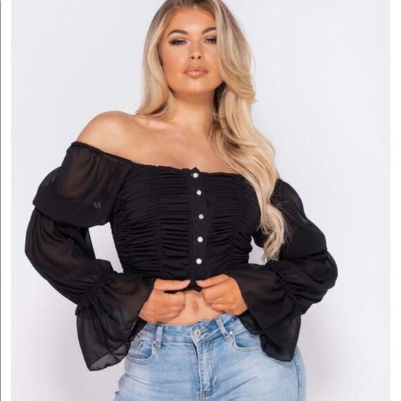NWT Parisian Off Shoulder Ruched Sheer Top Womens 8 Black Romantic Coquette