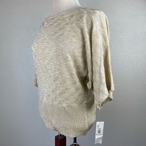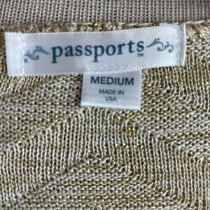 Super cute and classic light weight sweater top by Passports featuring a metallic gold sparkle throughout. It measures 21 inches armpit to armpit laying flat and 23 inches in length from shoulder to hem.