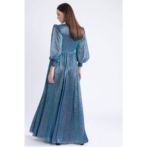 Show-stopping belted maxi dress in a lightweight lurex fabric with a metallic ombre effect. Plunging v-neckline with rhinestone belt center and front slit. Billowing sleeves with slightly structured shoulder details. PatBO's lamé gown is woven with shimmering tonal-blue and silver threads that'll catch the light as you move. It has voluminous puffed sleeves, a wrap-effect bodice and a leg-baring slit through the skirt. The waist ties can be adjusted with the crystal-encrusted buckle.