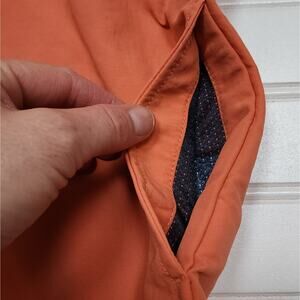 NWT Patagonia Kids Baggies Jacket, size XL (14), color is called Coho Coral w/ Pimento Red, wind and water resistant with durable water repellent finish (DWR), 40+ UPF sun protection, two hand warmer pockets, front-yoke seam with a snapped chest pocket, three-panel hood with side elastic has a stay-put fit, for protection from sun, wind and light rain.