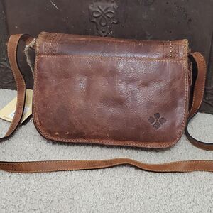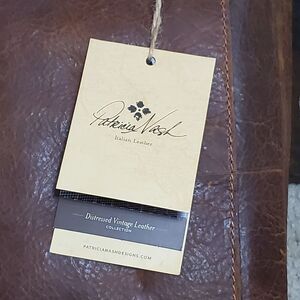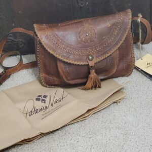 The bag also has a magnetic and snap closure, with a detachable strap and original dust bag included in the purchase. The interior is lined with soft suede material in a brown color, complementing the exterior color. This bag is part of the Patricia Nash Beaumont product line and is a stylish addition to any wardrobe.