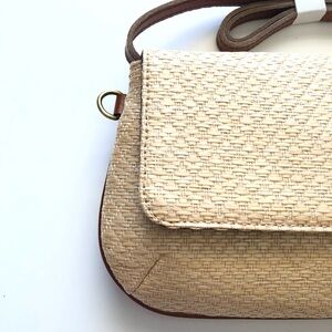 The bag is made of high-quality raffia, leather, and cotton materials, with a tan fabric lining and gold hardware accents. It has both inner and outer pockets for ample storage space, and is lightweight enough to carry all day. This crossbody bag also comes with a detachable strap and original dust bag for added convenience. Perfect for any occasion, this Patricia Nash Caprina crossbody clutch is a true gem.