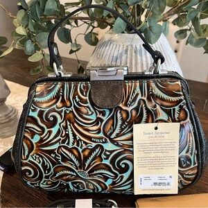 NWT Patricia Nash Gracie Brown and Turquoise Tooled Leather Bag