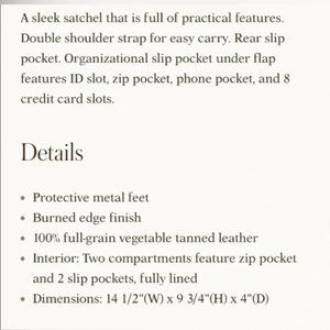 Beautiful satchel in tan color and vegetable leather. Not sold anymore. Never used. *may have storage indentations.