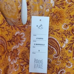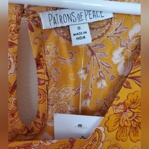 Patrons of Peace mini dress size small new with tags. Paisley and floral print. Lots of ruffles on the bottom. Approximate measurements provided. Skater. Edgy. Festival. Concert. Feminine. Flirty. Neutral.