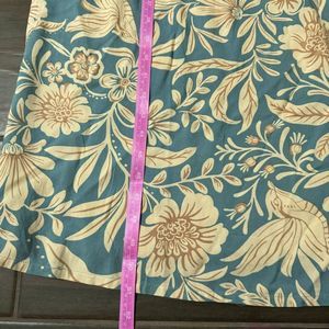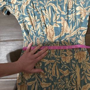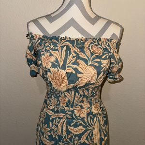 Patrons of Peach Blue Floral Print Smocked Maxi Dress. Pullover style with smocked/strechy waist. Smocking/stretch in short cap sleeves and along bust so it could be worn on or off the shoulder. High slit at the front. Blue gray with cream/orange tropical floral print throughout.