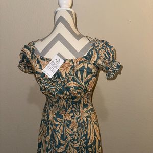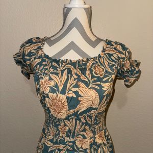 NWT Patrons of Peach Blue Floral Print Smocked Short Sleeve Maxi Dress Small