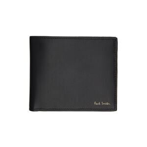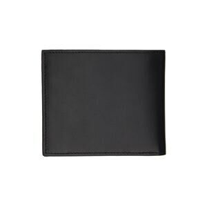 Buffed leather bifold wallet in black. Logo stamped in gold-tone at face. Four card slots, three note slots, coin pouch, and signature multicolor stripes at interior. Canvas lining in black. Approx. 4.25" length x 3.75" height x 0.75" width.