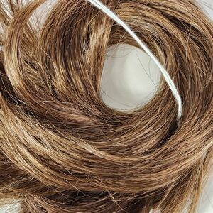 Wispy elasticized hair piece wraps easily around your bun or ponytail. Crafted of easy-care Kanekalon® synthetic that holds the style all day long. Length: 3". Weight: 0.6 oz. It definitely has gold in it. Camera lighting is difficult to work with. But these wraps don't need to match perfectly, they'll blend.