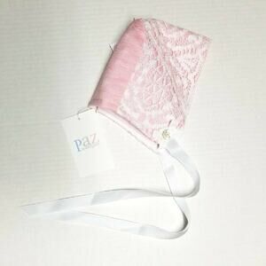 Gorgeous bonnet by Spanish designer Paz Rodriguez! Size 12 months (6-12 months) Pale pink linen like fabric, with white lace overlay. Pearlized logo button. High quality, beautiful craftsmanship. New with tags and immaculate condition! Perfect for spring and summer.