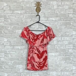 Soft, stretchy palm print ruffle off the shoulder maternity top. Peach/pink shades.