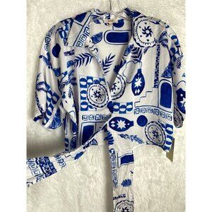 NWT Peach Medium Blue & White Short Sleeve Crop Top Waist Tie Collared V-Neck