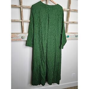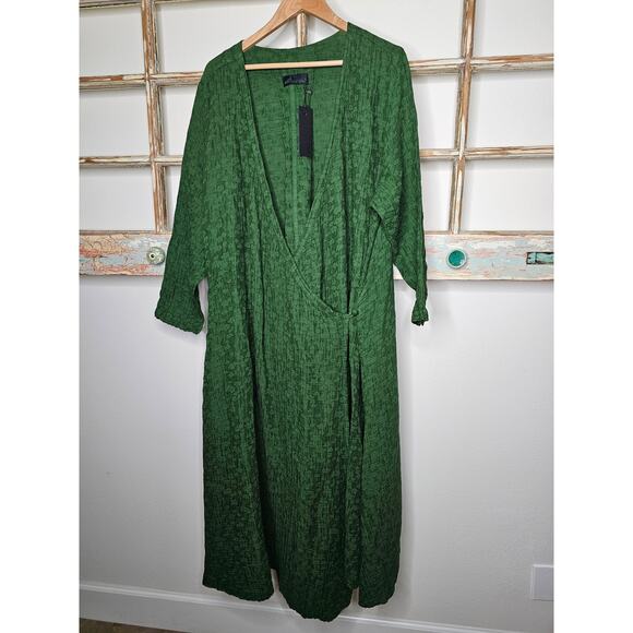 NWT Peacock Ways Green Long Sleeve Wrap Dress Oversized Large. This dress or overcoat is a linen/cotton blend measuring 28" pit to pit and 53" in length. It has a beautiful waffle texture and a lightweight wear.
