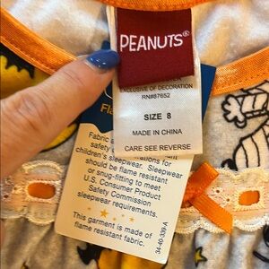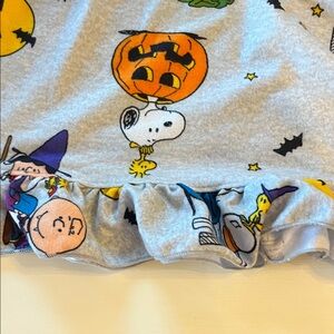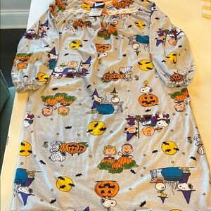 Adorable Peanuts nightgown with Halloween theme. Features beloved characters and festive pumpkins. Soft and cozy flannel.