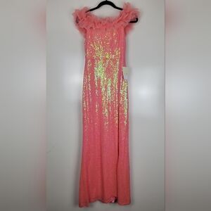 NWT Pear Culture Juniors Tulle-Trim Off-The-Shoulder Sequin Gown in Coral Size 9
